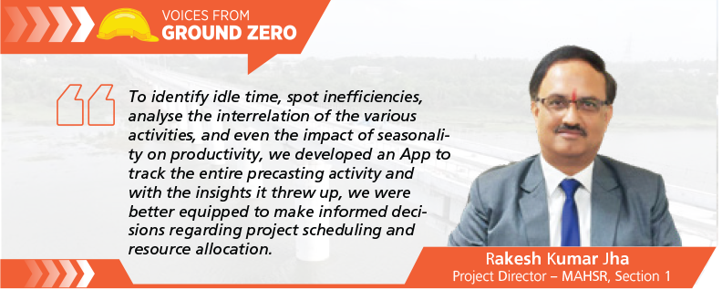 “We realized that we first needed to know the time taken for each activity,” points out Rakesh Kumar Jha, Vice President & Project Director – MAHSR, Section 1. “To identify idle time, spot inefficiencies, analyse the interrelation of the various activities, and even the impact of seasonality on productivity, for the monsoons and labour migration patterns were leading to fluctuations in the availability of skilled workers, we developed an App to track the entire precasting activity and with the insights it threw up, we were better equipped to make informed decisions regarding project scheduling and resource allocation,” he highlights.