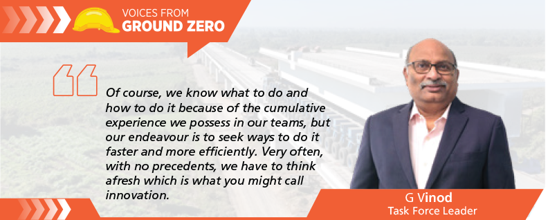 Perhaps, one of the toughest challenges (and there are many!) facing Task Force Leader, G Vinod and his various teams at the Mumbai-Ahmedabad High Speed Rail (MAHSR) project is the sheer magnitude and pace of construction, hitherto unheard of or seen in the Indian construction industry. “Of course, we know what to do and how to do it because of the cumulative experience we possess in our teams, but our endeavour is to seek ways to do it faster and more efficiently,” he says. “Very often, with no precedents, we have to think afresh which is what you might call innovation,” he flashes a quick smile. While various teams from both Heavy Civil Infrastructure & Transportation ICs are straining every muscle and sinew to keep up with the tall asking rate, Vinod will certainly agree that technology has been their great ally, the veritable wind beneath their wings.