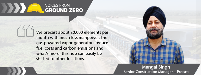 After much brainstorming, the team boldly decided to manufacture more than 60% of these elements inhouse by developing a robust manufacturing hub with minimal human interface, designed to achieve 1.5 cycles per day. Measuring 150 m x 75 m with 3 bays of 25 m each, the hub is equipped with several features. An automated concrete supply system transports concrete from the two batching plants in a shuttle and pours it precisely into the Comcaster and Framecaster. Overhead cranes, an automated runoff truck, a chiller plant, boiler house, GAS bank, stacking yard, and an adequate drainage system completes the set up.