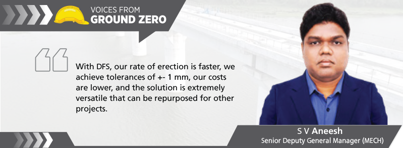 Apart from operation efficiency, DFS has improved quality, safety and sustainability much to Senior Deputy General Manager (MECH), S V Aneesh’s satisfaction. “Our rate of erection is faster, we achieve tolerances of +- 1 mm, our costs are lower, and the solution is extremely versatile that can be repurposed for other projects.”