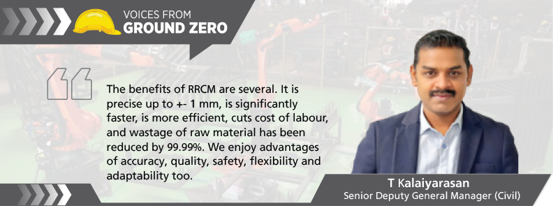 “The benefits of RRCM are several,” smiles a pleased T Kalaiyarasan, Senior Deputy General Manager (Civil), ticking them off on his fingers. “It is precise up to +- 1 mm, is significantly faster, is more efficient, cuts cost of labour, and wastage of raw material has been reduced by 99.99%.” He pauses and adds, “We enjoy advantages of accuracy, quality, safety, flexibility and adaptability too.”