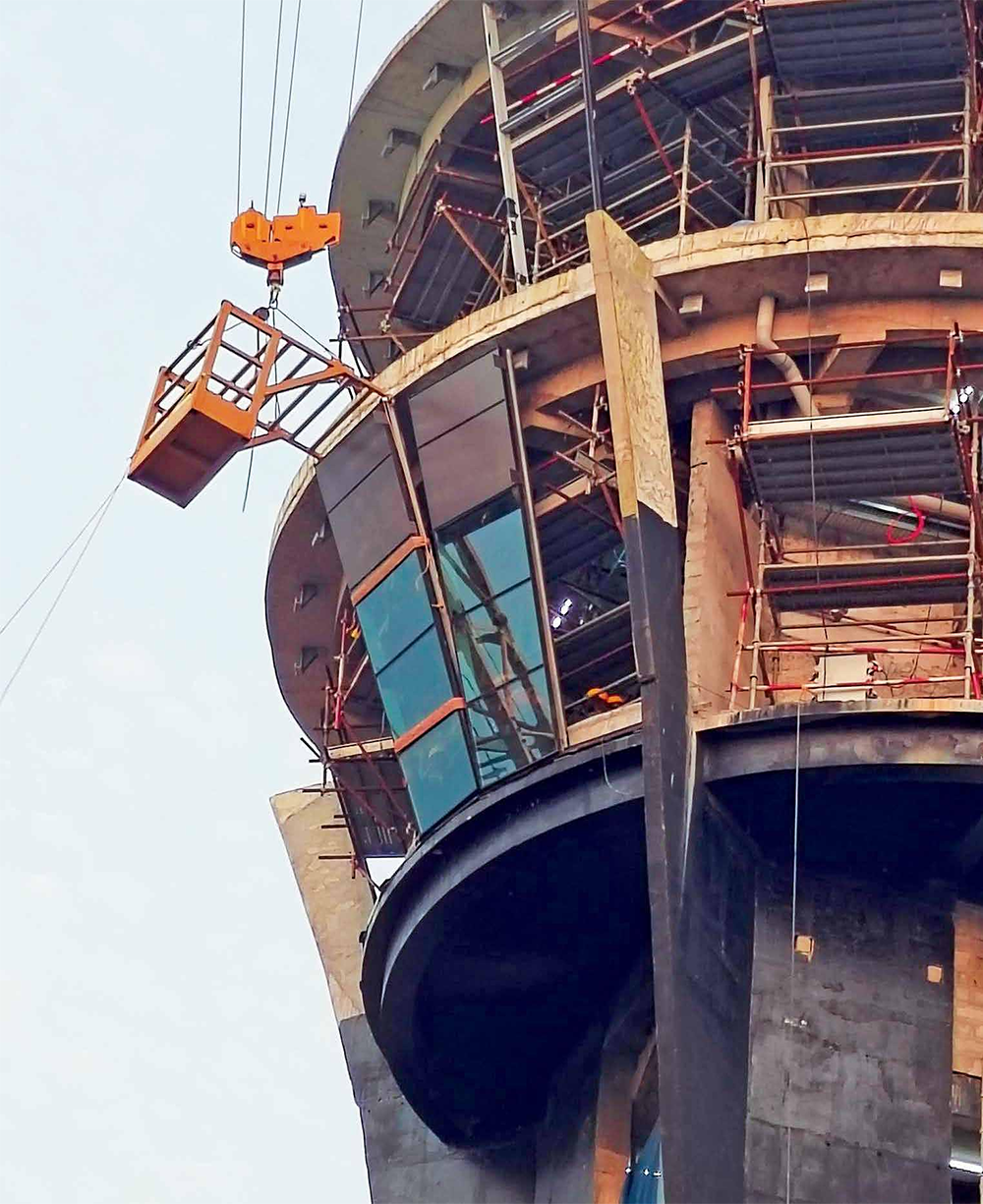 The forecourt area was a chaotic, highaltitude symphony, for structural steel had to be erected to a height of 16 m, with teams busy with concrete shuttering directly beneath in the line of fire. We introduced a suspended scaffold system, with the working platform placed at a height of 16 m, erected using MEWPs to mitigate fall risks.