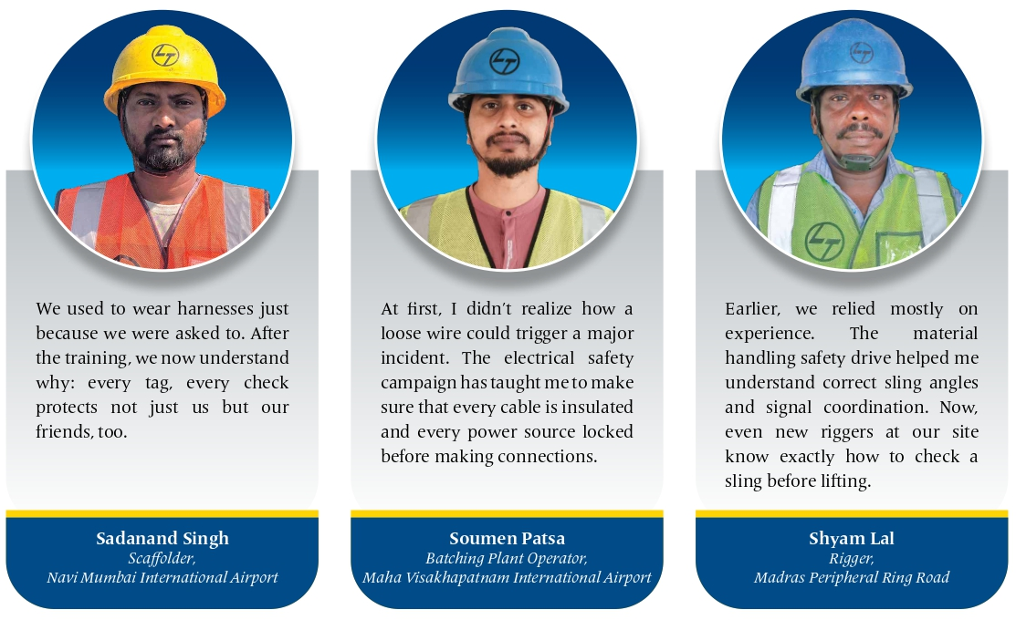 During the electrical safety campaign at the Maha Visakhapatnam International Airport (MVIAL) site, cable safety management was identified as a focus area, while the work-at-height safety campaign proved useful at the Meghalaya Assam Bridge Project (MABP) through live fall-arrest and rescue drills, where supervisors practised real-time retrieval operations. For riggers at the Madras Peripheral Ring Road Project, the material handling campaign changed long-held habits, while scaffolders at the Navi Mumbai International Airport Project learned to view safety differently. “These are just some examples; our campaign has certainly been impactful, for we have successfully course-corrected or even eliminated certain behavioural risks associated with these four activities,” reminds Yadhu.