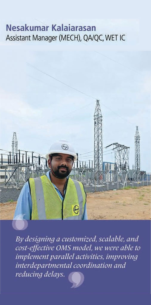 Acknowledging the merits of collaboration, Nesakumar is all praise for the strategic direction of his seniors and the support from the top management, EDRC, F&A, EHS, and Quality teams across HQ, BU, and the Cluster. “Their strategic involvement ensured cross functional coordination for faster issue resolution and empowered the site teams through training, resources, and leadership.” He is equally moved by L&T’s commitment to empowering employee with ownership and innovation. “Whether it is developing inhouse systems like the OMS or driving productivity through collaborative execution, L&T fosters a culture where ideas are valued and excellence is expected, trusting its employees and creating an environment where speed, scale, and quality are not just goals but shared achievements.” His commitment to the Company he keeps shines through.