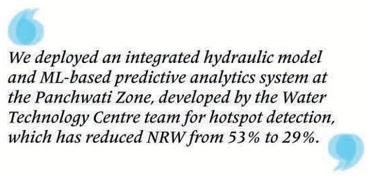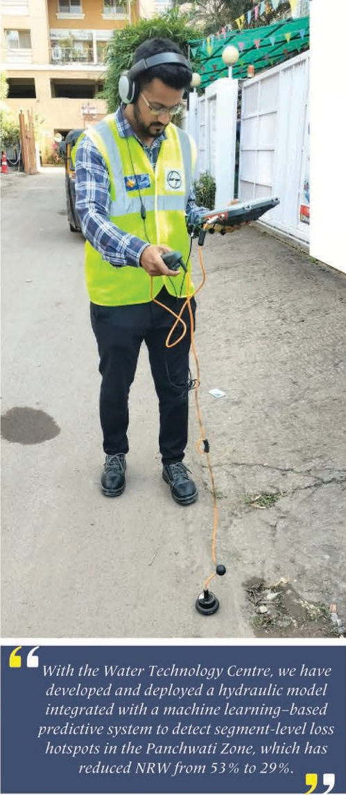“We successfully executed a Proof of Concept on water loss detection by implementing Digital Twin technology, in collaboration with our international partners, Status 4, Brazil, and Smarterra,” he shares. “Further, we deployed an integrated hydraulic model and ML-​based predictive analytics system at the Panchwati Zone, developed by the Water Technology Centre team for hotspot detection, which has reduced NRW from 53% to 29%.” A Water Audit Software developed in-​house and implemented at the Pune Municipal Corporation has improved data-​driven decision-​making and network performance monitoring and Rajshekhar is delighted that NRW has reduced from 65% to 19% in Baner Gaon Zone 2 & Ahiregaon Zone (DMA 1).