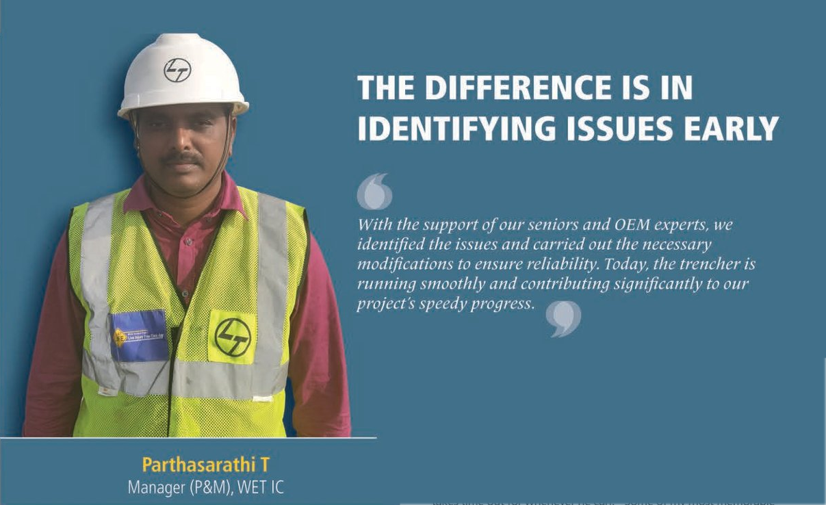 He is particularly delighted with the automatic trencher that he and his team have deployed at the Mandya project site to lay HDPE pipes, which not only has improved their efficiency but has also been pivotal in helping them complete their activities on time as planned Parthasarathi agrees that it was not all smooth sailing, for the initial trials of the trencher revealed technical issues. The project team was, however, on a mission. “With the support of our seniors and OEM experts, we identified the issues and carried out the necessary modifications to ensure reliability,” he says with the expression of a mission accomplished. “Today, the trencher is running smoothly and contributing significantly to our project’s speedy progress.”