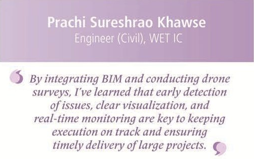 The supportive role played by her seniors and team members has been crucial in driving her digital intent at site. Yes, she nods, that there was some initial resistance but overcame it by conducting awareness sessions and demonstrations to build the team’s confidence. “My seniors have guided me with their strategic vision, timely feedback, and encouragement while my team members have collaborated actively by sharing inputs from the site, assisting in data collection, and ensuring smooth adoption of these technologies.” She is thankful for their trust, and teamwork that have motivated Prachi to deliver better, faster, more accurate, and scalable solutions. She longs for an Al-​powered predictive analytics tool integrated with BIM and project data.