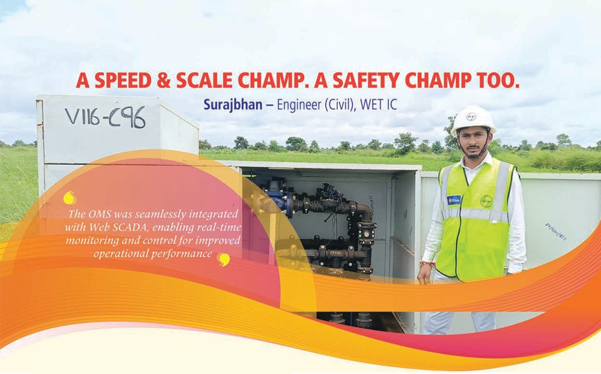 Just two years with L&T and yet Sumit Goswami, a GET of the 2023 batch, has already worked across five project sites at different locations: Hatpipaliya Micro Lift Irrigation Project, Chhaigaonmakhan Lift Irrigation Scheme, Alirajpur Lift Irrigation Scheme, Narmada Kshipra Multipurpose Project, and currently ISP Kalisindh, where he has been part of the team implementing the in-​house OMS box, apart from material procurement; mechanical assembly & testing; site foundation; mechanical, electrical, & instrumental installation; and cabinet enclosure works. “Implementing precast pile/​footing foundations (at 1.5–2.0 m depth) based on soil conditions, reducing settlement issues, and eliminating rework have enhanced the structural stability of the OMS boxes and improved the lifecycle performance,” he explains.