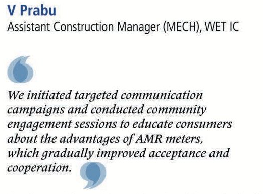 By putting his belief into action, Prabu led the efforts to streamline the survey by organizing focused teams, using digital tools for faster data collection, and mapping to create and sustain consumer awareness. “We initiated targeted communication campaigns and conducted community engagement sessions to educate consumers about the advantages of AMR meters, which gradually improved acceptance and cooperation,” Prabu adds.